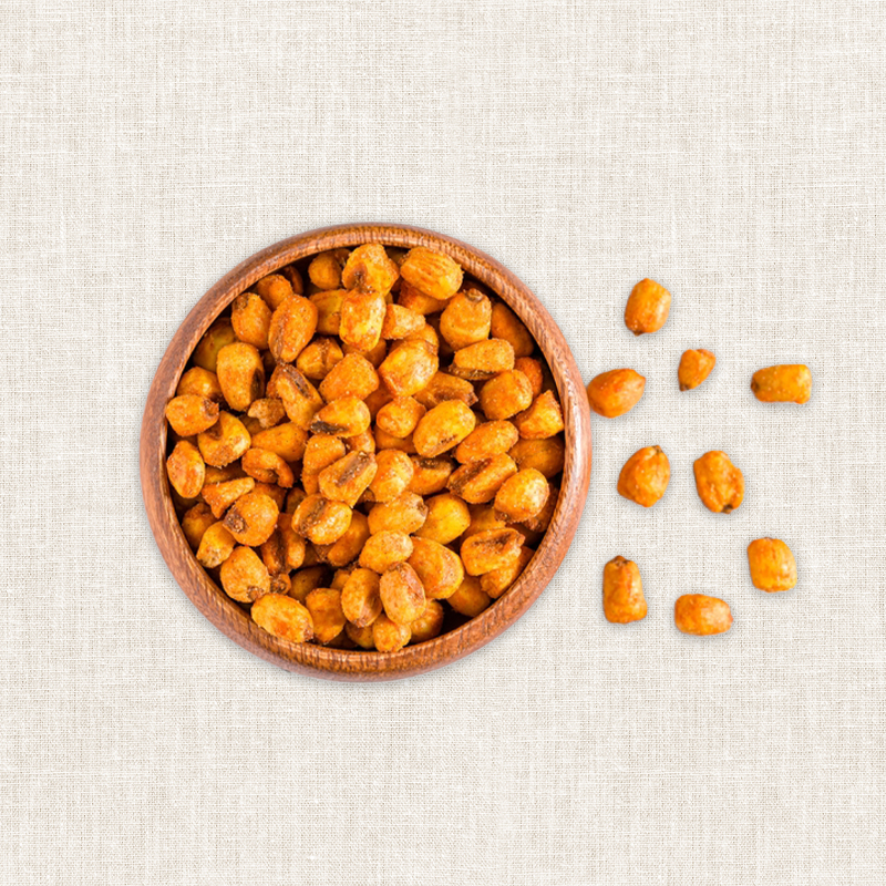 Enjoy roasted Spanish corn topped with a natural ketchup coating, the perfect snack between meals, on the go, or with nuts and salads.