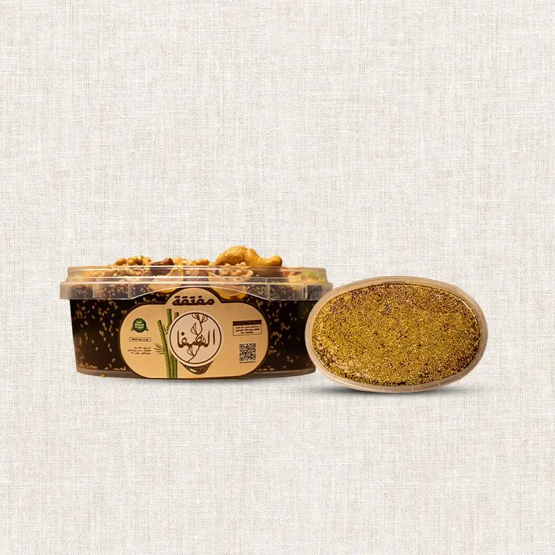 "مفتقة غنية بمزيج طبيعي من عسل أسود نقي، مع سمسم محمص ومكسرات مختارة، ومتتبلة بخليط أعشاب مميز فيه الحلبة والينسون والشمر علشان تدّي طاقة وفايدة بطعم أصيل."