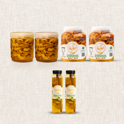( ٢ برطمان عسل بالمكسرات - ٢ برطمان عسل بالكاجو - ٢ عبوة عسل بقطع القرفة والزنجبيل )